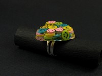 Bague artisanale en résine incrustée de petites fleurs multicolores en argile polymère.