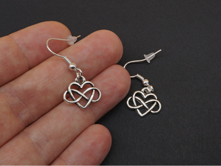 Boucles d'oreilles fantaisie, breloques en métal argenté coeur et signe infini entrelacés.